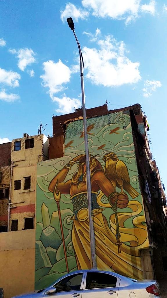 Nofal's artistry is a unique blend of graffiti and traditional painting techniques, skillfully using both aerosol and watercolors to create vibrant and captivating works. Drawing from the rich history and mythology of Egypt, Nofal reimagines the ancient tales on the walls of his city, keeping the spirit of these stories alive through his contemporary style.